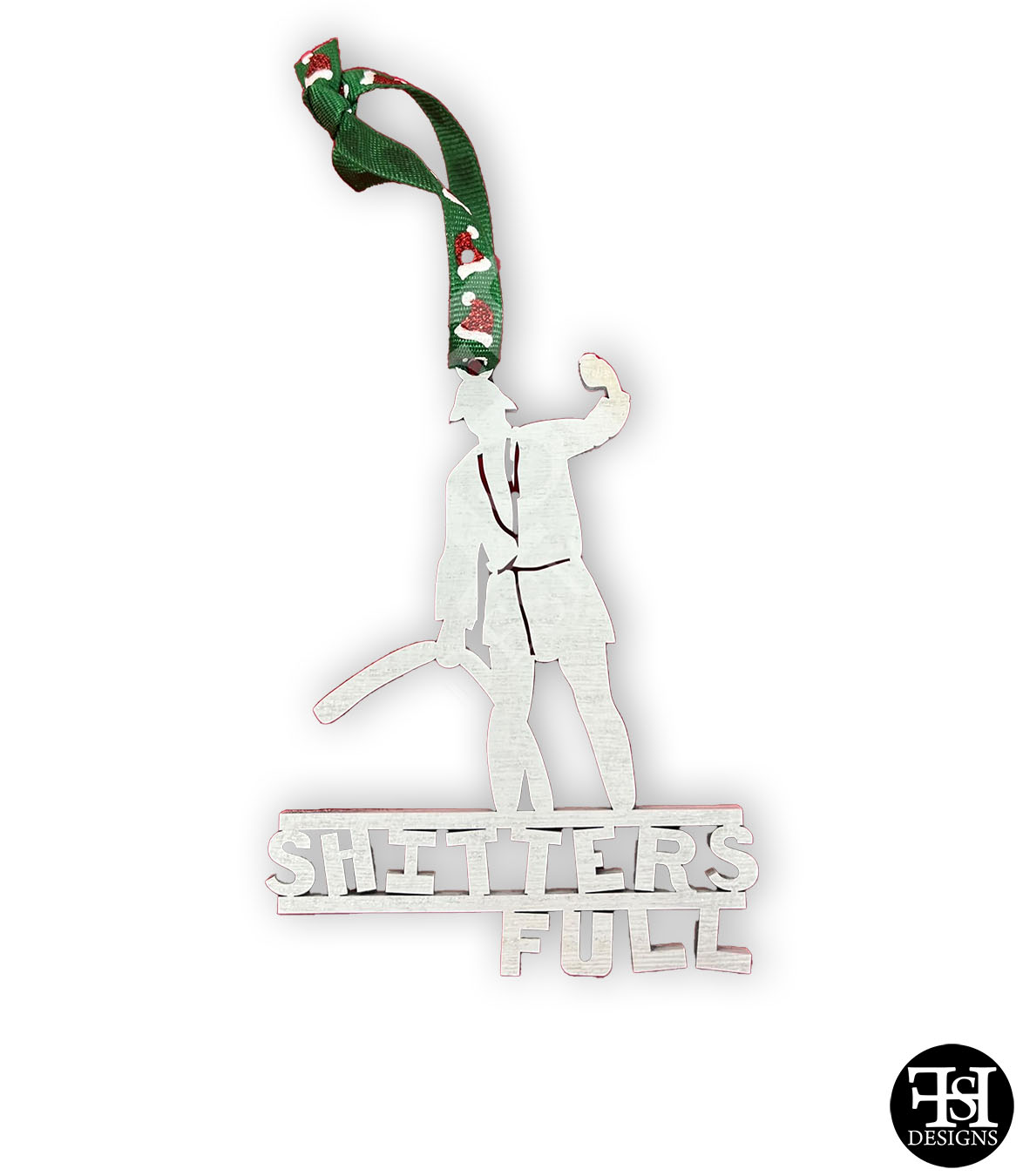 "Shitters Full" Cousin Eddie white painted Christmas ornament.