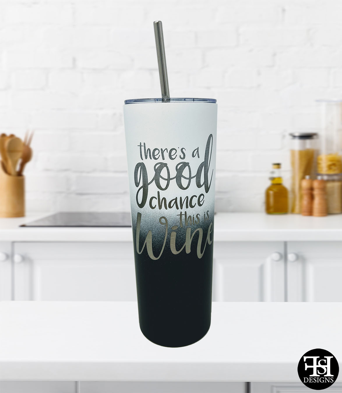 "There's A Good Chance This Is Wine" laser etched white, blue and black skinny 20 ounce tumbler.